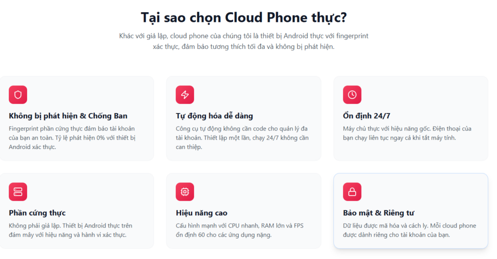 Sự vượt trội của Max Phone Farm Cloud không chỉ nằm ở việc giải quyết lỗi lo phần cứng, mà còn mang lại những lợi thế công nghệ cực kỳ mạnh mẽ: